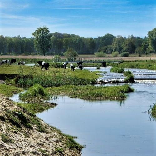 Rund um die Hansestadt Ommen schlängelt sich die Overijsselse Vechte ruhig durch eine Landschaft, die der Fluss selbst im Laufe der Jahrhunderte geformt hat. Die Vechte hat hier ein breites Tal ausgeschliffen, das reich an Natur und Vielfalt ist. Man findet alte Flussarme, blumenreiche Wiesen, Waldränder, Auenwiesen und Wallhecken, die zusammen die typische Landschaft des Vechttals prägen. An den Ufern liegen kleine Teiche, Weidenwälder und Wiesen, auf denen gemütlich Kühe grasen. Im Frühling färben sich die Wiesen gelb von Dotterblumen und Pfingstrosen. Im Sommer blühen Seerosen in den stillen Gewässern. Die umliegenden Sandböden wechseln sich mit Wäldern, Heideflächen und Sandverwehungen ab. Hier und da tauchen jahrhundertealte Bauernhöfe auf, verborgen zwischen Bäumen und Wallhecken.